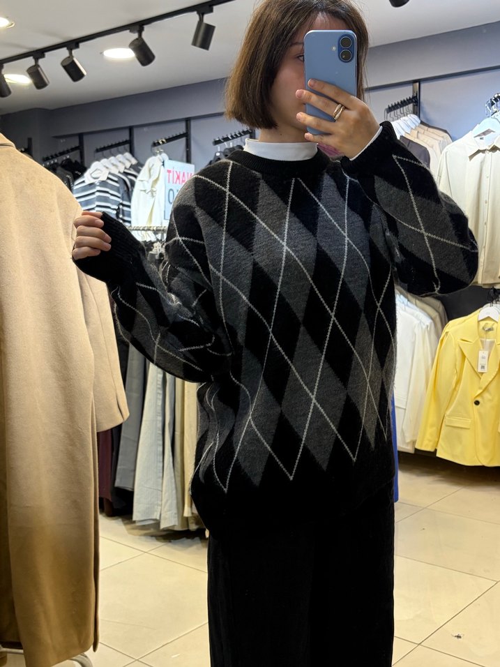 Kadınlar için gri ekoseli, salaş kesim, uzun kollu, yuvarlak yakalı örme triko kazak. Günlük kullanıma uygun, rahat ve şık bir görünüm sunar.