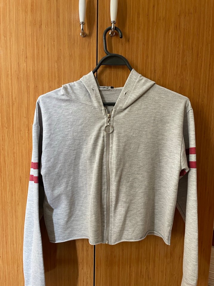Uzun kollu, fermuarlı gri kadın sweatshirtü, bisiklet yakalı ve hafifçe dar kesimdir. Kollarında kırmızı çizgiler bulunur, yumuşak ve rahat bir dokusu vardır.