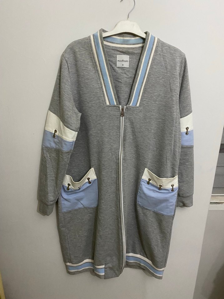 Kadınlar için gri, uzun, fermuarlı ve rahat kesimli sweatshirt. Cep ve kollarda baskılı detaylar, kesik yaka ve yumuşak, sıcak kumaştan üretilmiştir.
