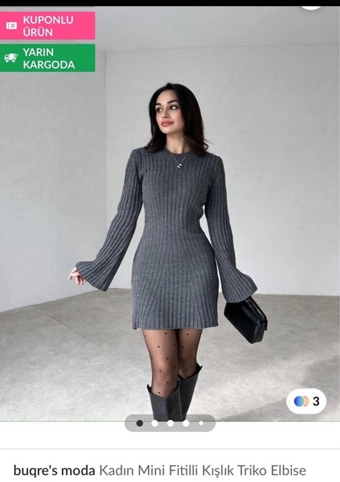 Kadın Gri Fitilli Kışlık Mini Triko Elbise
