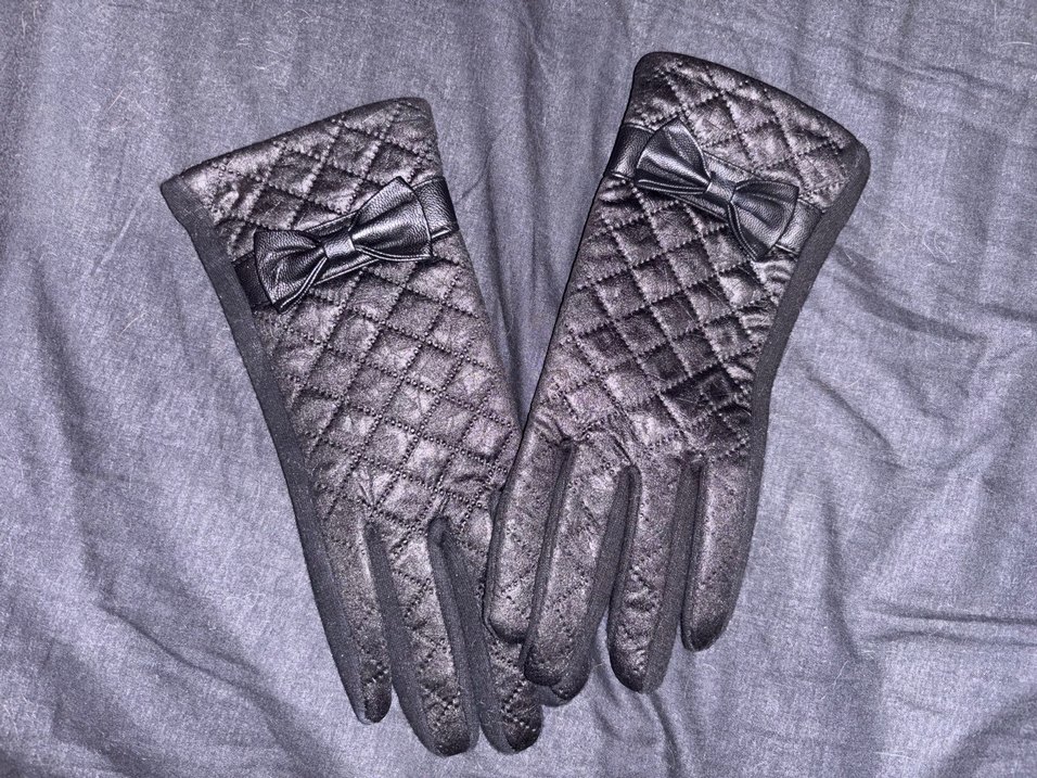Kadınlar için gri renkte, suni kumaştan yapılmış, fiyonk detaylı kapitone desenli gotik eldivenler.