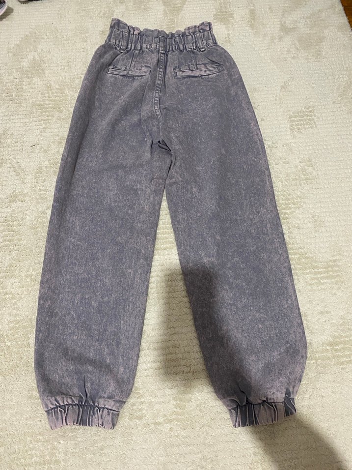 Gri mor desenli, bol kesim denim pantolon. Lastikli bel ve paçalar rahat 2 kere giyildi sadece kilo aldığım için satıyorum