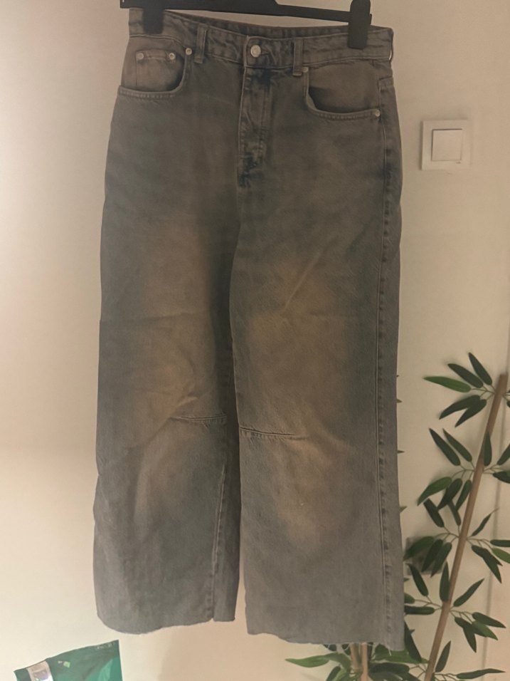 Kadınlar için bol kesim ve midi boyda, gri ve kahverengi tonlarında denim kot pantolon. Günlük kullanım için rahat ve şık, sokak modasına uygun.