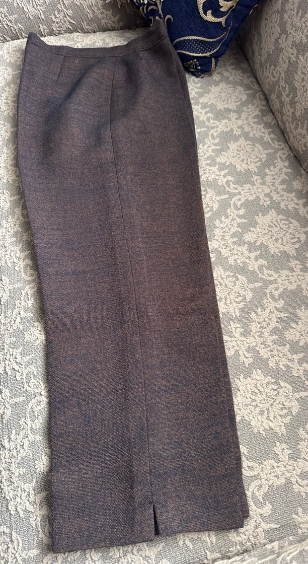 Ofis için uygun, pilili ve midi boyda, gri-kahverengi tonlarında rahat kesim kadın kumaş pantolon.