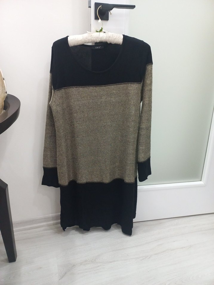 Kadınlar için uzun kollu, yuvarlak yaka, yumuşak yün kumaştan örülmüş triko tunik. Gold ve siyah tonlarında, bol kesim ve uzun boyda, günlük kullanıma uygun rahat bir model.