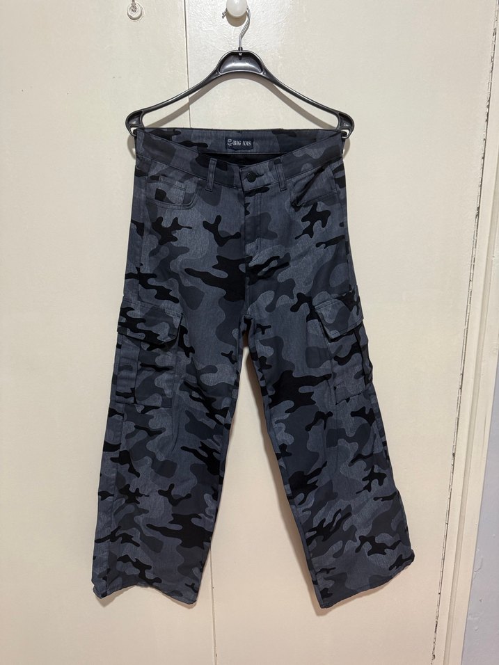 Gri kamuflaj desenli, bol kesim kot pantolon. Midi boyda, sokak stiline uygun, dış mekan kullanımı için ideal.