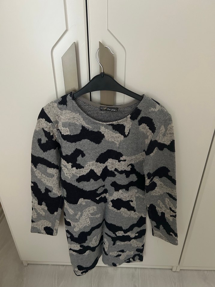 Kadınlar için gri kamuflaj desenli, yuvarlak yakalı ve uzun kollu triko elbise. Rahat kesim ve midi boy, yumuşak dokulu tekstil malzemeden örülmüştür.