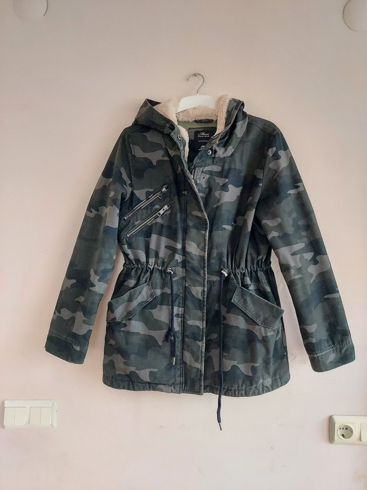 Gri kamuflaj desenli, kemerli ve bol kesim kadın ceketi. Notlu yaka ve askılı kollarla, yumuşak ve sıcak kumaştan üretilmiştir.