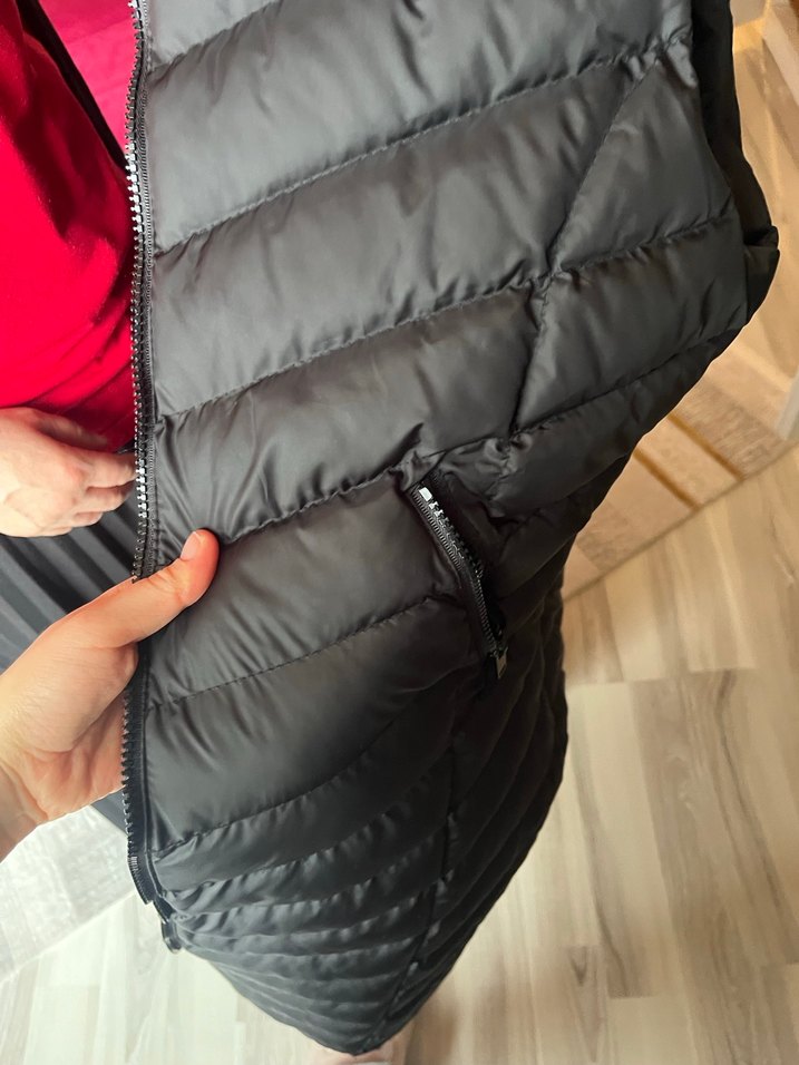 Kadınlar için yüksek yakalı, fermuarlı cep detaylı, sentetik kumaştan üretilmiş, gri kapitone, normal boy, sıfır kollu, dar kesim yelek.