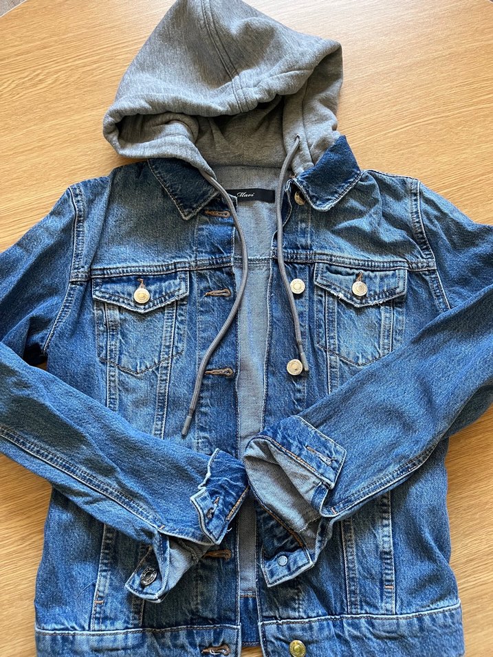 Kadınlar için düğmeli, uzun kollu ve bol kesim denim ceket. Gri kapüşonlu detayla rahat ve katmanlı görünüm sağlar. Günlük kullanıma uygun.