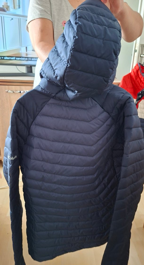 için fermuarlı, kapüşonlu, yüksek yakalı, sentetik kumaştan gri tonlarında, uzun kollu ve normal midi boyda mont. Dış mekan ve sokak tarzı için uygun.