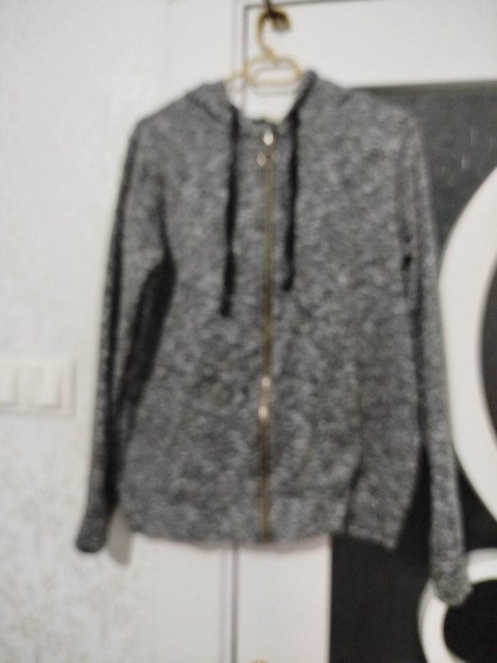Kadınlar için gri renkte, kapüşonlu ve fermuarlı, uzun kollu, vücuda oturan sweatshirt. Yumuşak sentetik kumaştan, günlük ve rahat sokak stili için uygundur.