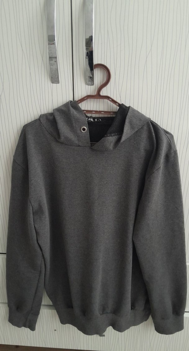 Kadın gri sweatshirt, bol kesim, uzun kollu ve yuvarlak yaka. Düğmeli detaylı, yumuşak ve sıcak kumaştan, günlük sokak stili için uygun.