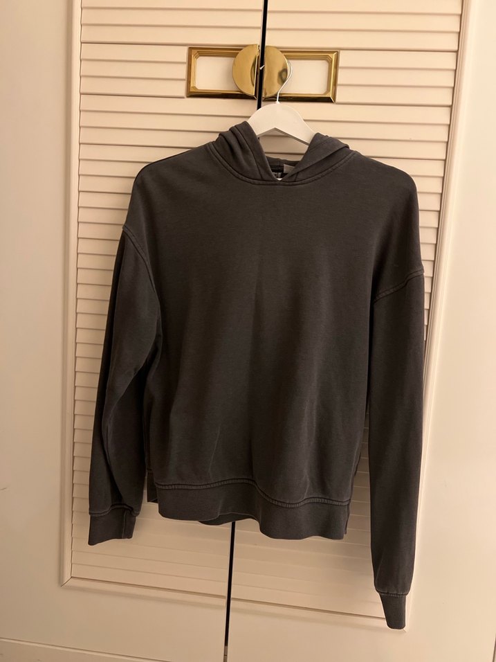 Kadın gri kapüşonlu sweatshirt, uzun kollu ve yuvarlak yakalıdır. Yumuşak ve sıcak kumaştan üretilmiş, rahat kesimiyle günlük kullanıma uygundur. Sokak stiline uyum sağlar.