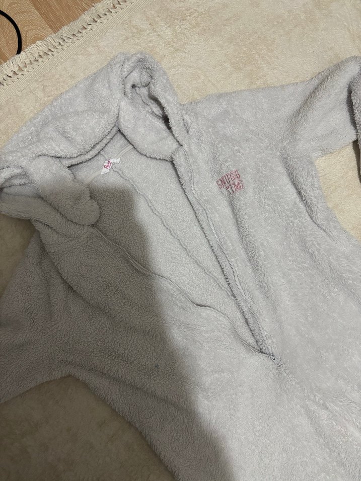 Tavşan kulak kapüşonlu, yumuşak ve sıcak kumaştan gri renkte, fermuarlı ve küçük nakış detaylı bornoz.