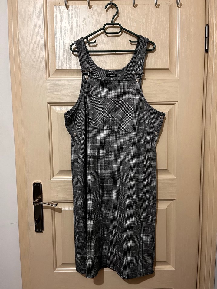 Kadın gri kareli midi tulum, sentetik kumaştan, bol kesim, askılı ve tokalı detaylara sahip. Günlük kullanıma uygun, grunge punk tarzında rahat bir model.