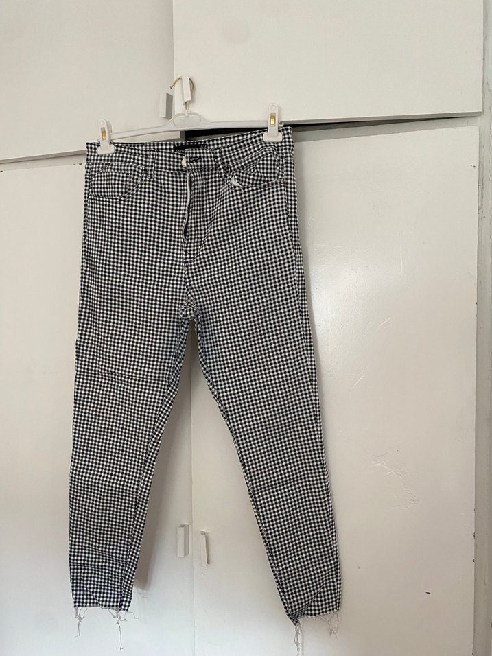 Gri kareli denim kumaştan, bel detaylı ve normal kesim midi boy kadın pantolon. Günlük kullanıma uygun, trend sokak stili pantolon.