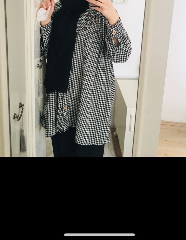 Siyah kareli, düğmeli midi tunik, bol kesim, uzun kollu ve boğazlı yakalıdır. Sentetik kumaştan üretilmiş, günlük rahat stil için uygundur.