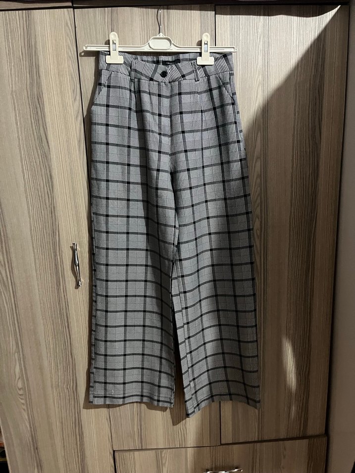 Kadınlar için gri kareli kumaş pantolonlar, normal boy ve kemerli bel ile günlük rahat kullanıma uygundur. Regular fit ve streetwear tarzındadır.