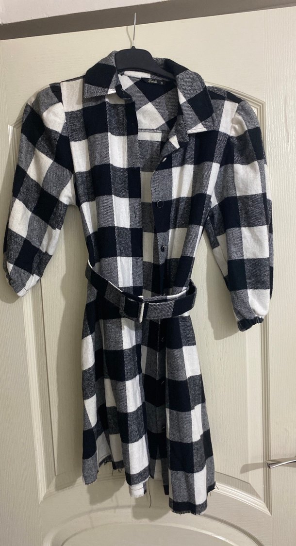 Kadınlar için kemerli, bol kesim, uzun kollu, yakalı gömlek. Gri kareli desenli, midi boyda, sentetik kumaştan günlük kullanıma uygun.