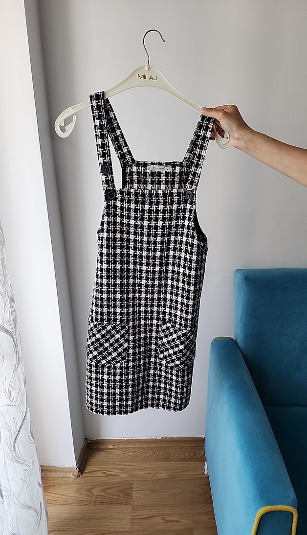 Kadın gri kareli kısa salopet, ayarlanabilir askılar ve ön ceplerle şık ve rahat bir görünüm sunar.