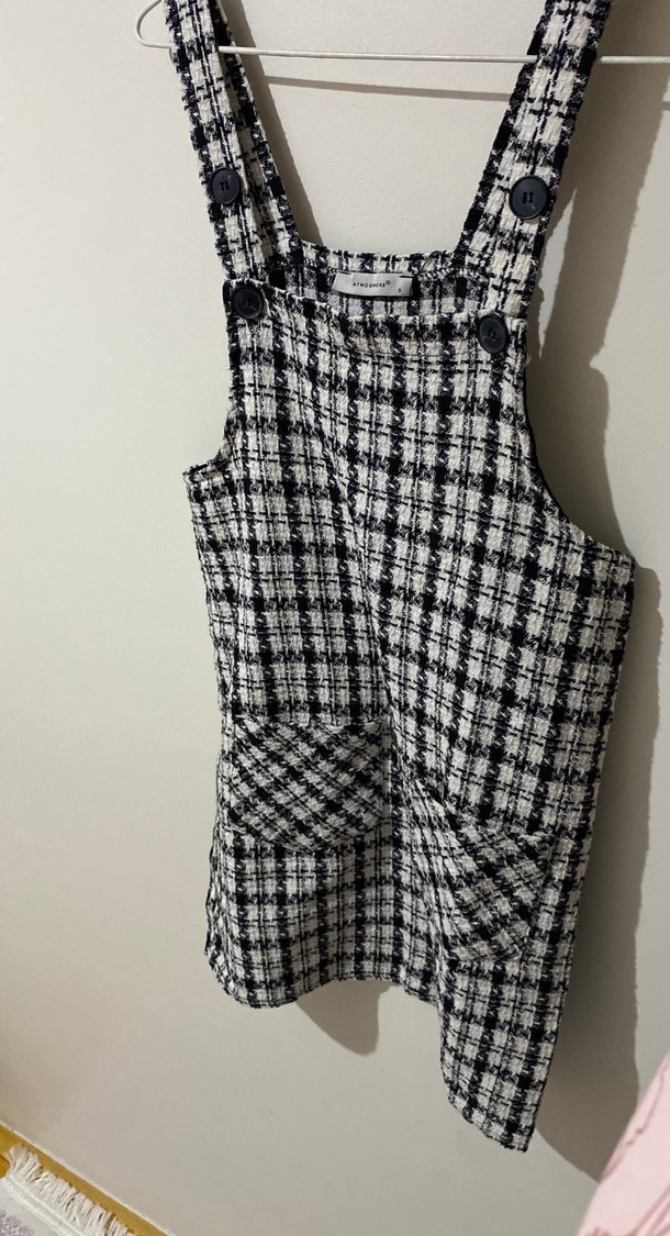 Gri kareli, kolsuz, yüksek yakalı ve örme dokulu kısa tulum. Normal kesim ve ön ceplerle günlük kullanıma uygun.