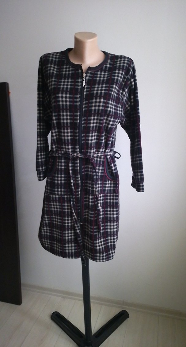 Kadınlar için uzun kollu, gri kareli desenli, midi boyda ve salaş kesimli bornoz. Belden bağlamalı, rahat kullanım sunar. ️Gloria Angel marka M BEDEN