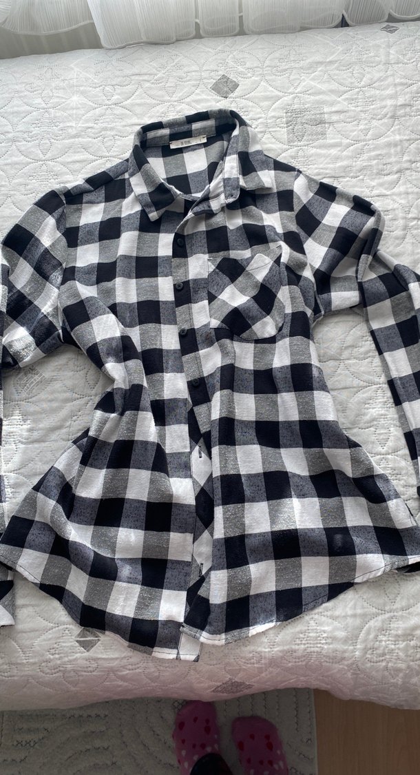 Pamuklu kumaştan, gri kareli, düğmeli ve yakalı, uzun kollu, bol kesim kadın gömleği. Rahat sokak stili için uygundur.