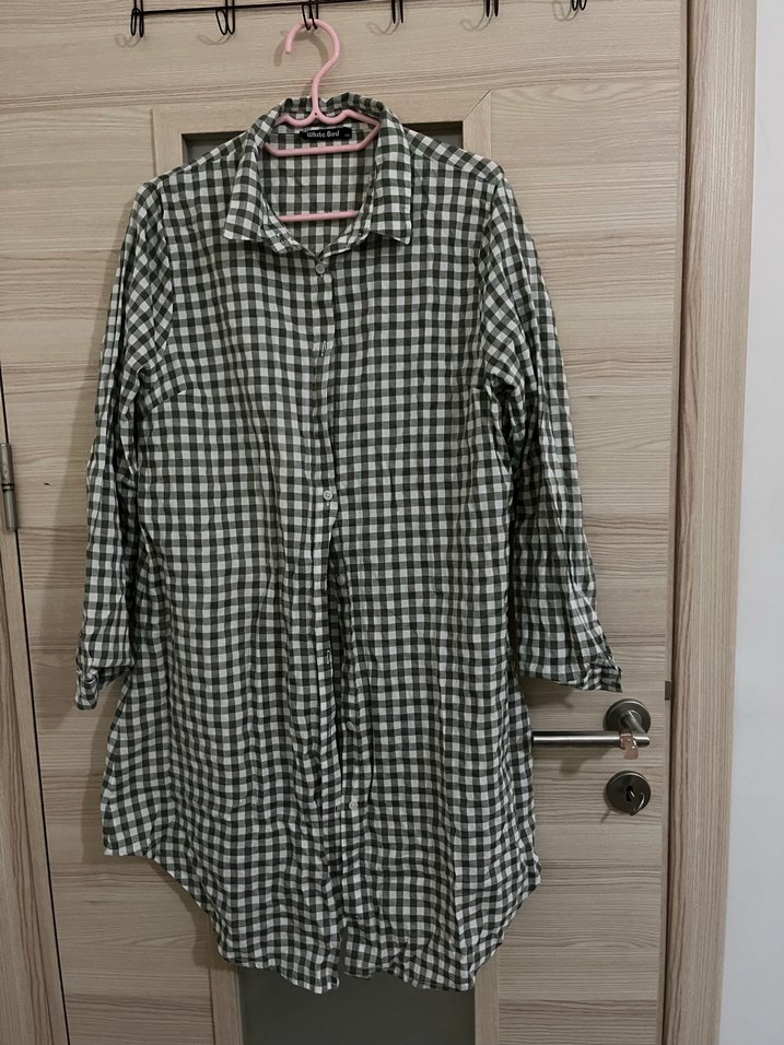 Kadınlar için tasarlanmış, pamuklu kumaştan gri kareli, uzun kollu ve düğmeli gömlek. Salaş kesimi ve yakalı tasarımıyla günlük rahatlık sunar.
