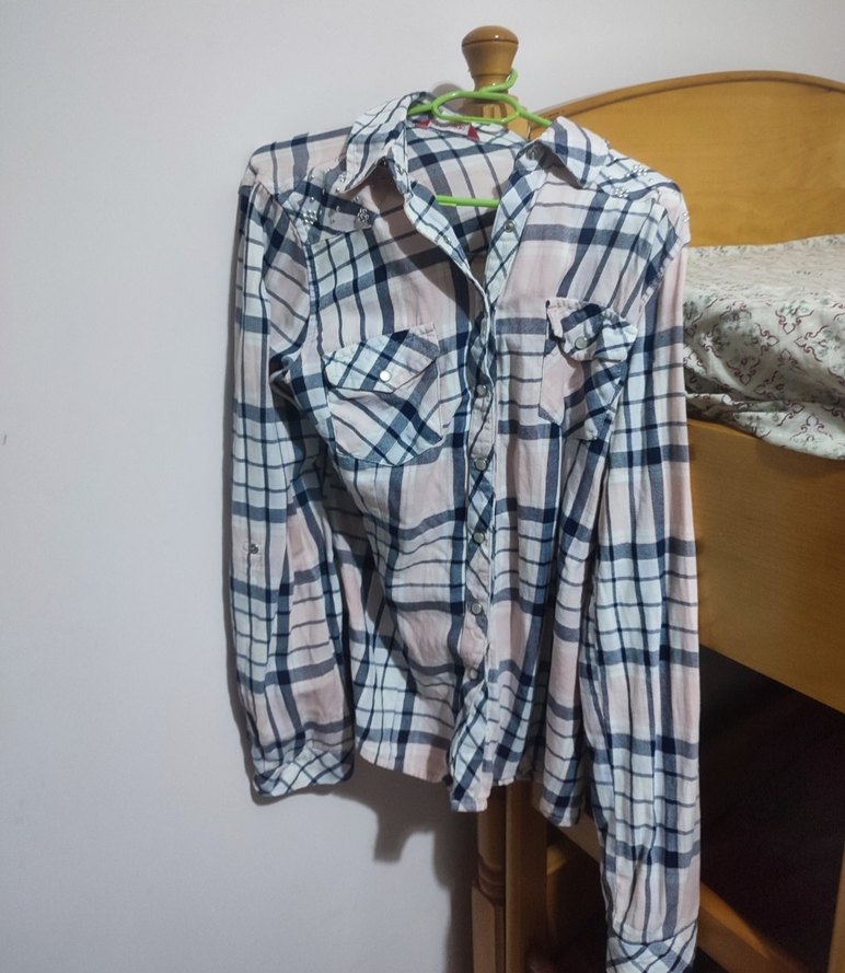 Pamuk kumaştan, düğmeli ve yakalı, bol kesim gri kareli uzun kollu kadın gömleği. Günlük kullanıma uygun rahat bir stil sunar.