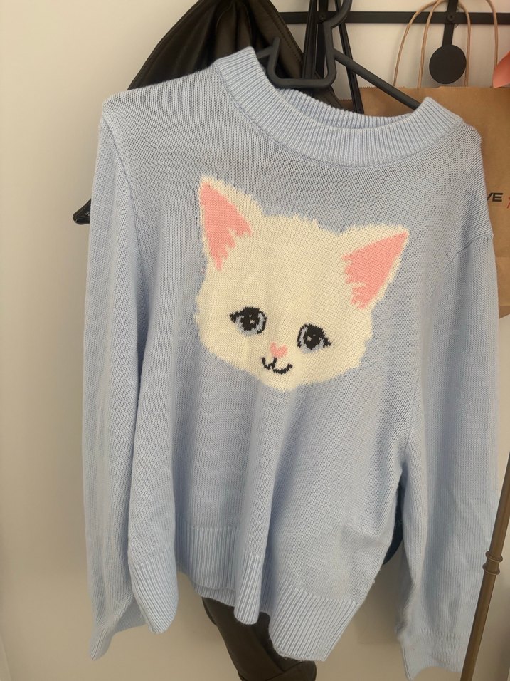 Gri pastel renkli, kedili baskılı, uzun kollu, bisiklet yakalı, bol kesim kadın triko kazak. Rahat ve günlük kullanıma uygun.