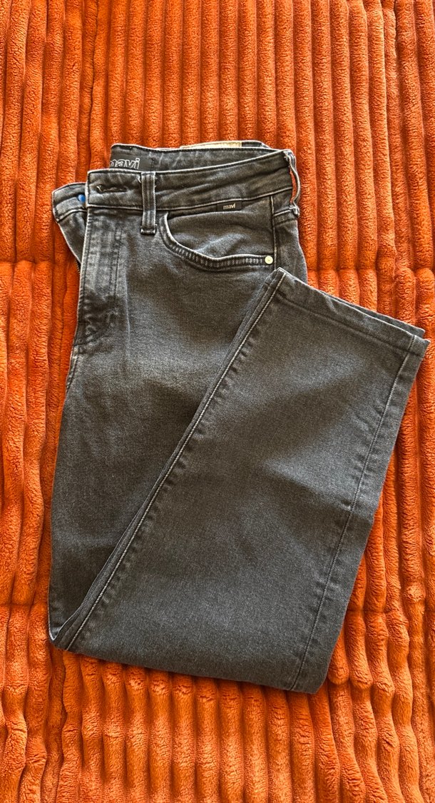 Kadınlar için gri tonlarında kemerli, normal boy midi uzunluğunda regular fit denim pantolon. Desensiz ve günlük sokak stiline uygun.