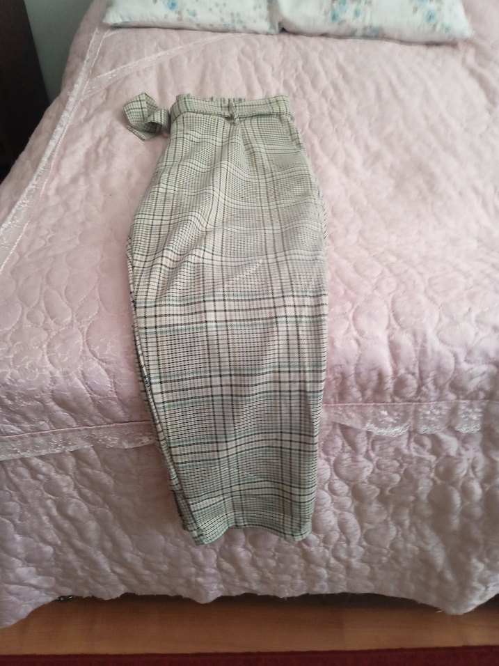 Kadınlar için uzun, gri kumaş pantolon. Düzenli kesim, kemerli bel ve sentetik kumaştan üretilmiştir. Günlük kullanıma uygun, rahat ve sade desenli.