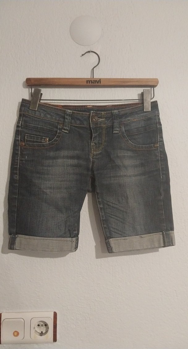 Kemerli, kısa boy, gri renkli kadın denim şort. Sade ve rahat, sokak stiline uygun, dış mekan kullanımı için ideal.