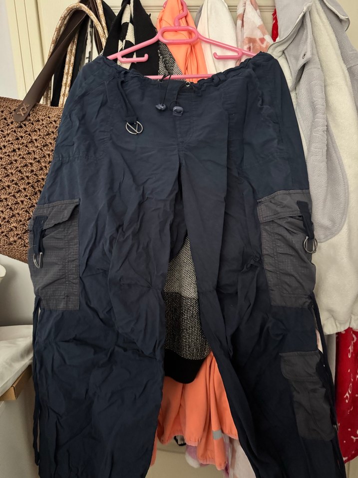Kadınlar için kemerli, bol kesim gri kumaş pantolon, çok cepli ve rahat sokak stili için uygun.