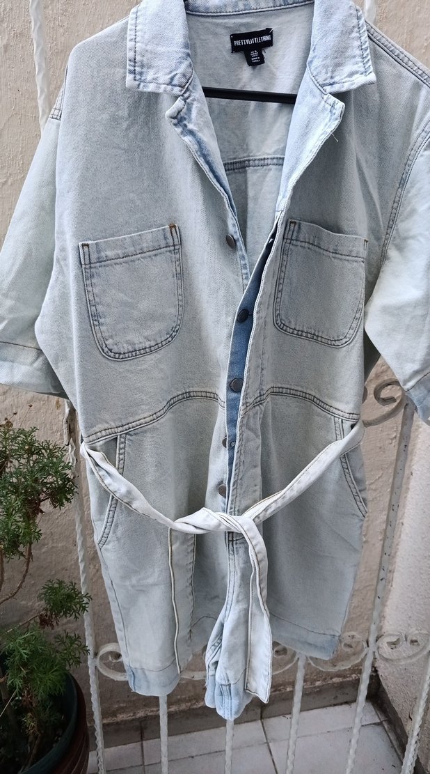 Kadınlar için kemerli, kısa kollu, yakalı uzun ve bol kesim gri denim tulum Günlük sokak stili için uygundur.