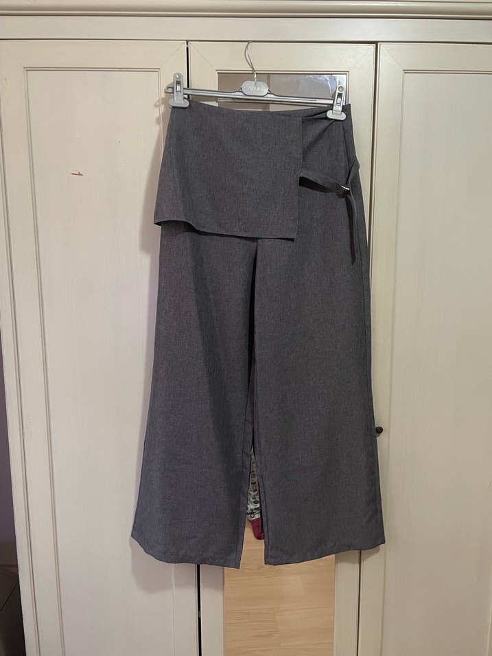 Gri renkli, etek tasarımlı, kemerli ve uzun kesim kadın kumaş pantolon. Sentetik kumaştan üretilmiş, iş ve sokak modasını birleştiren sade tasarıma sahip günlük kullanıma uygun pantolon.