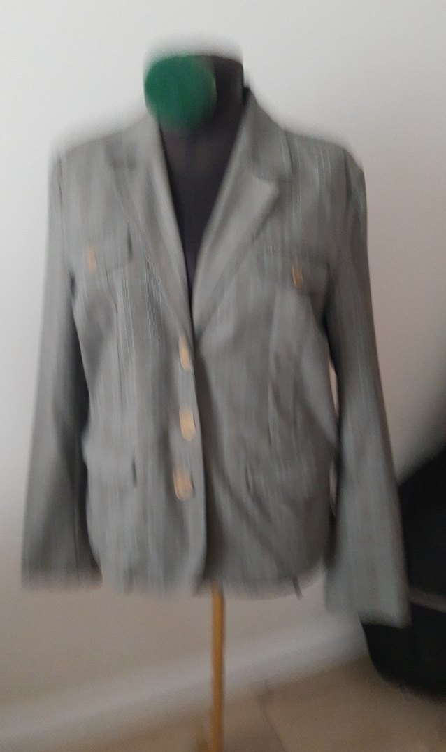 Kadınlar için gri keten kumaştan, kısa boylu ve düğmeli mini blazer. Uzun kollu ve kesimi klasik, iş ortamına uygun.