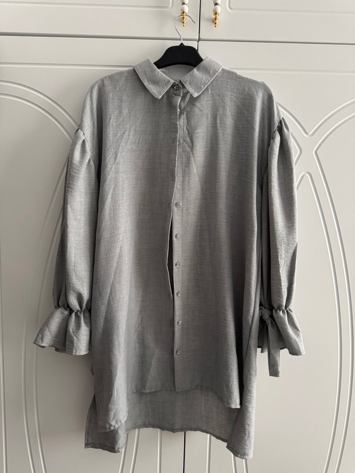 Gri keten kumaştan, düğmeli, yakalı ve uzun kollu, salaş kesim günlük sokak tarzı gömlek. TAKIMDIR