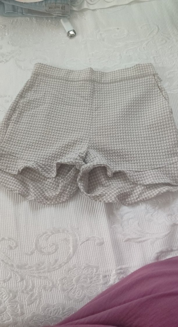 Gri keten kumaştan, fırfırlı kenar detayına sahip, vücuda oturan mini şort. Rahat sokak stili için uygundur.