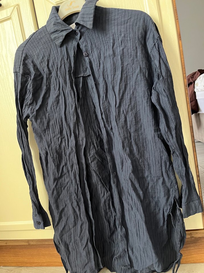 Gri keten kumaştan yapılmış, pileli detaylı, uzun kollu ve yakalı. Salaş kesimi ve uzun boyuyla günlük rahat bohem tarz sunar.
