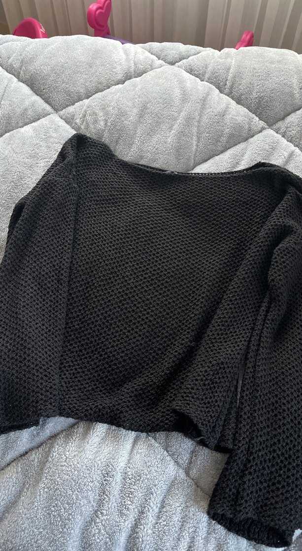 Kadınlar için keten kumaştan örülmüş, uzun kollu ve kayık yaka, siyah renkte rahat kesim triko. Günlük kullanıma uygundur. İç gösterir, son fotoğraftaki gibi bir defosu vardır.