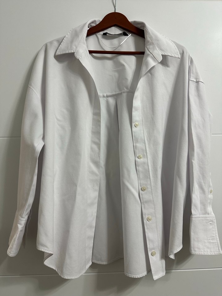 Kadınlar için keten kumaştan, düğmeli ve yakalı, uzun kollu, normal kesim, minimalist tarzda gri gömlek. Günlük kullanıma uygundur.