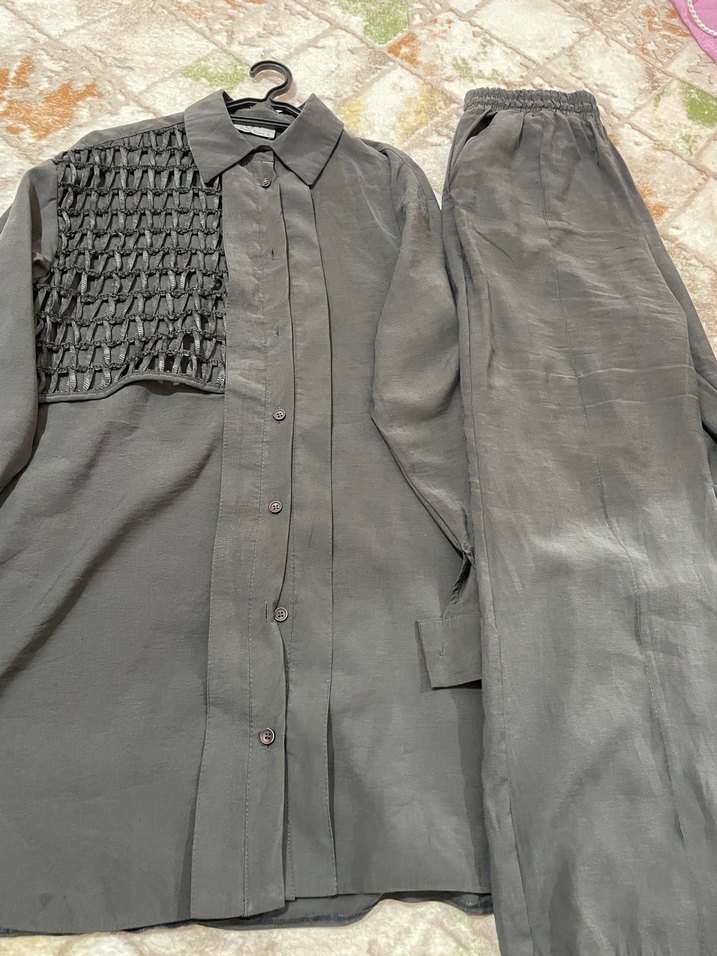 Kadın gri keten uzun takım elbise, düğmeli gömlek ve elastik bel pantolon içerir. Tek omuzda dokulu detay bulunur. Ofis için uygun, sokak tarzı havasında.
