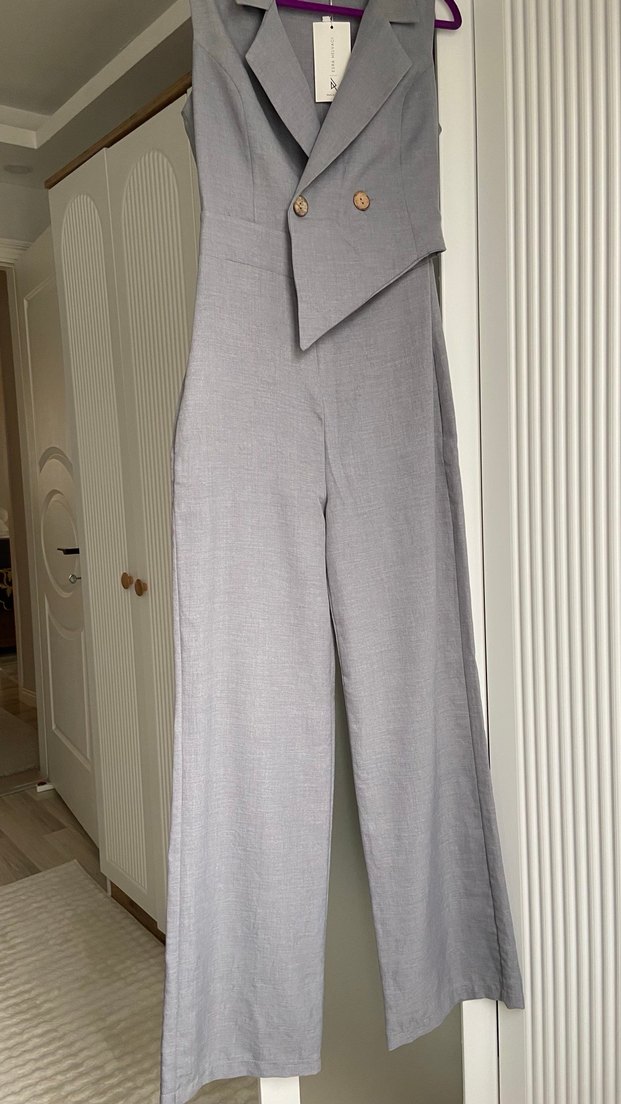 Kadınlar için keten kumaştan yapılmış, düğmeli, yakalı ve kolsuz uzun tulum. Gri renkte, ofis ortamına uygun rahat kesim tulum.