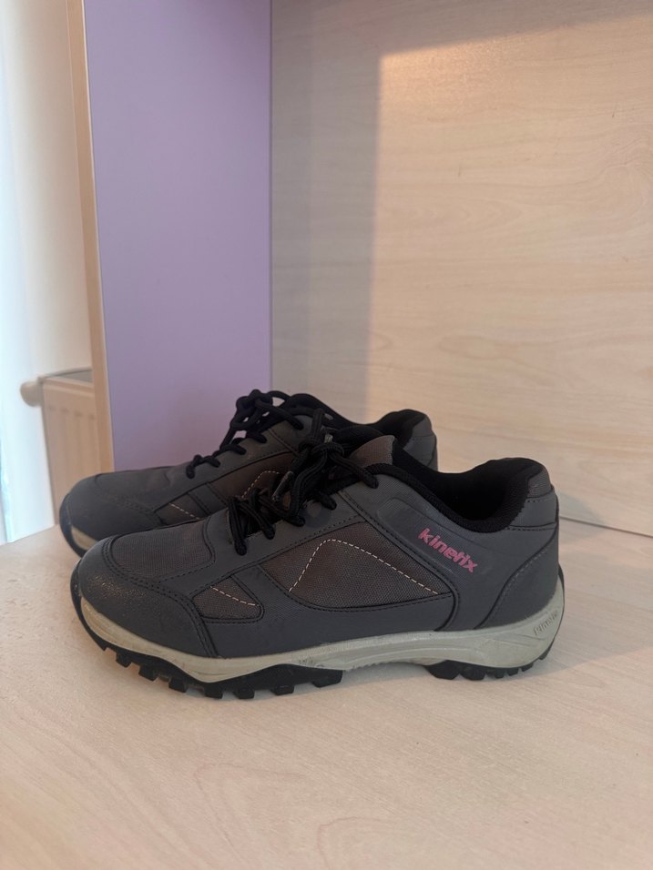 Gri renkli Kinetix kadın spor ayakkabısı, bağcıklı ve baskılı detaylara sahip, 38 numara . Tabanıda açık gri .