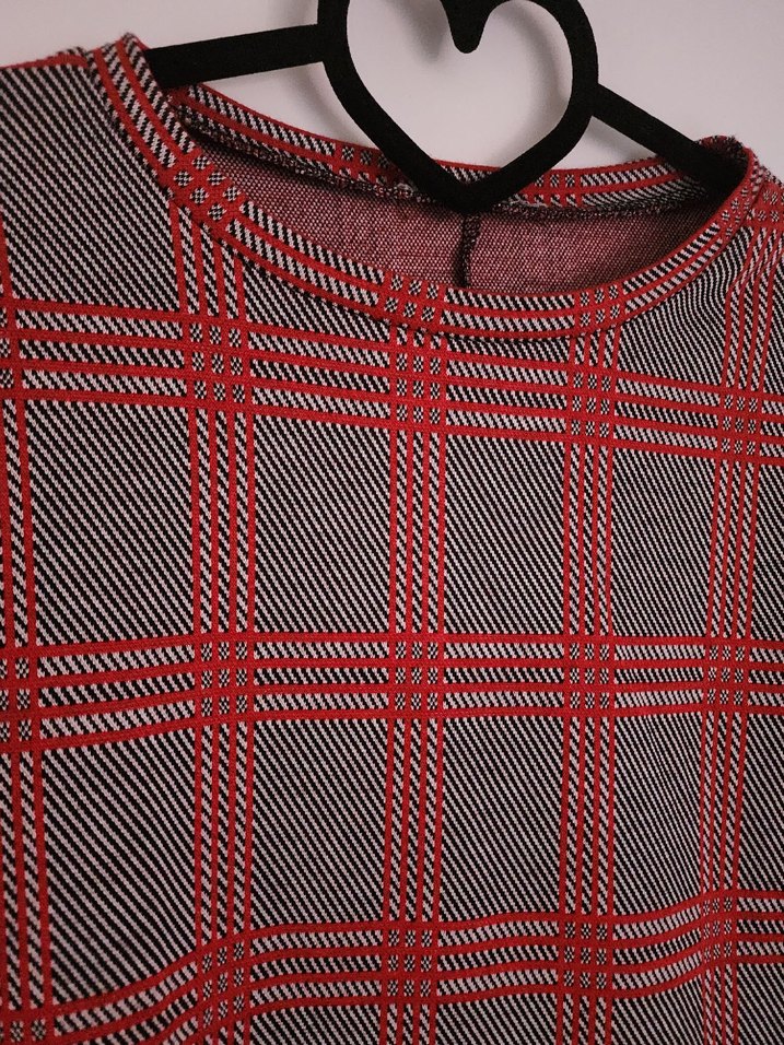 Kadın triko elbise, tekne yaka ve kisa kolludur. Kırmızı ve gri kareli desene, tuylu etek ucu ve normal kesime sahiptir. Midi boy, sokak stiline uygundur.
