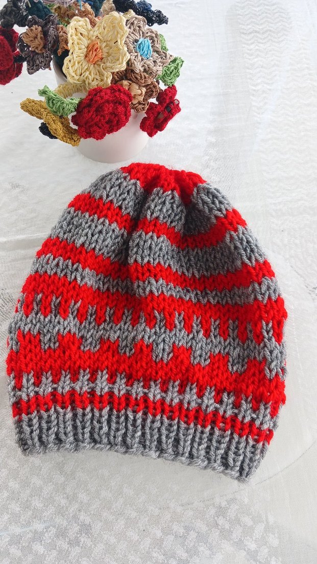 Kadınlar için gri ve kırmızı çizgili örgü bere, yumuşak örgü kumaştan yapılmıştır ve rahatlık sağlar.