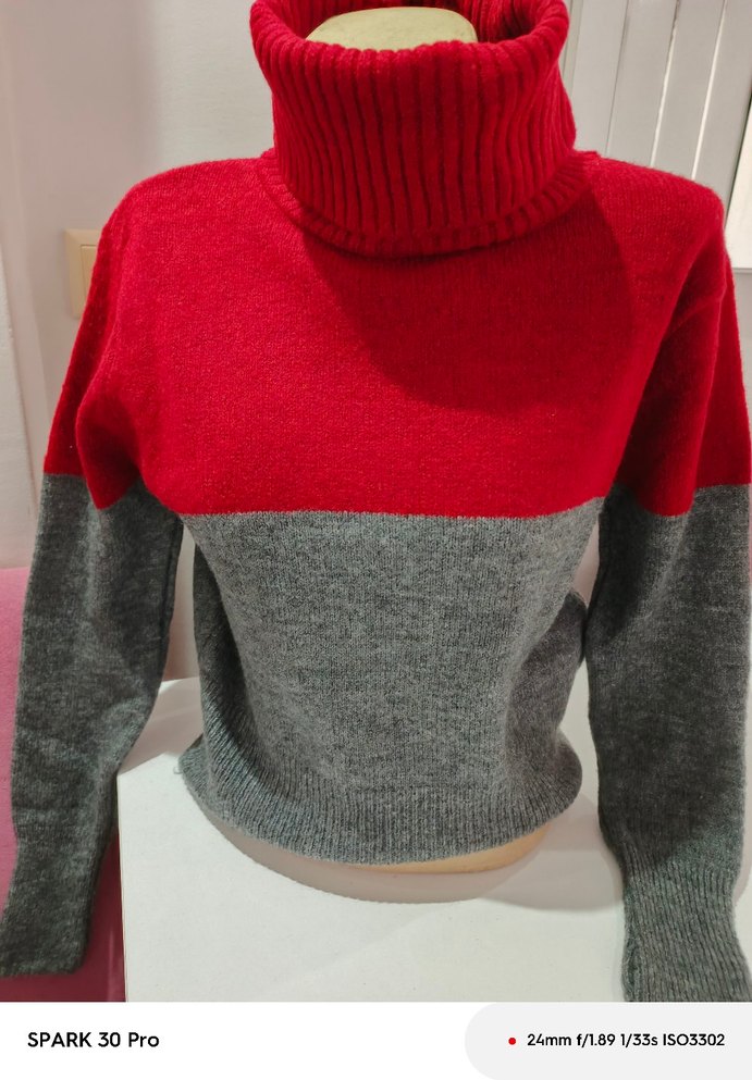 Fitted kesim kadın kazak, örgü boğazlı ve uzun kolludur. Kırmızı ve gri renk bloklu, yumuşak yün malzemeden günlük kullanım için uygundur.