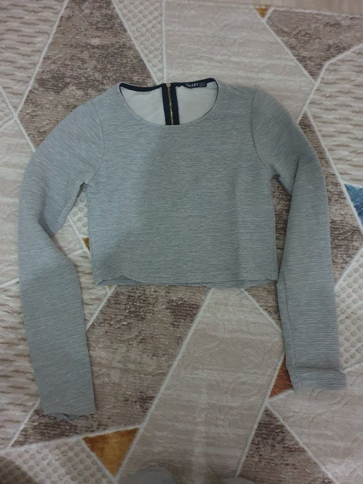 Kadın gri sweatshirt, uzun kollu, yuvarlak yaka ve kısa, fit kesime sahiptir. Sırtında fermuar bulunur, sentetik kumaştan üretilmiştir, günlük rahat stil için uygundur.